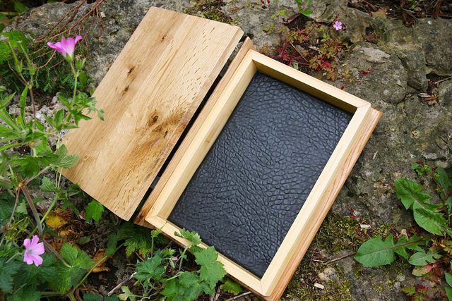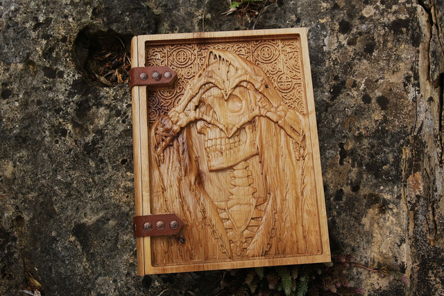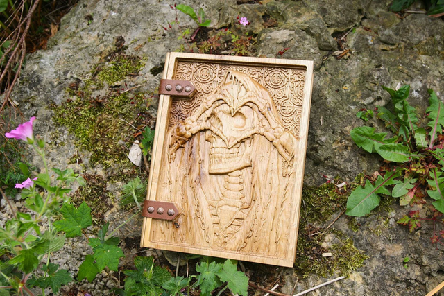 Very large box, made from upcyled oak, intricate CNC carving on fron and lase engraving on the spine.