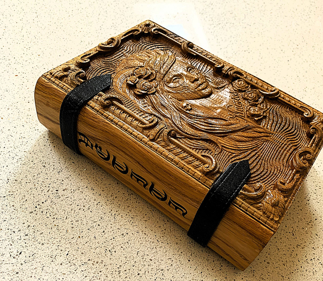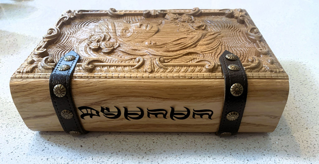 Medium box, made from upcyled oak, intricate CNC carving on fron and lase engraving on the spine.